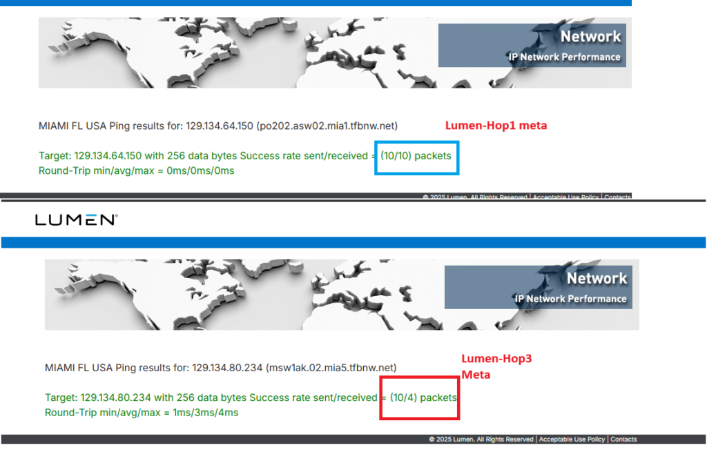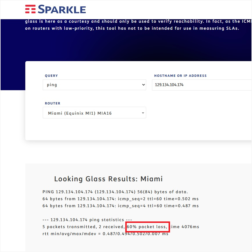 You will see that once you find the affected upstream or downstream route combination, you will have 10-60% packet loss to the destination host.